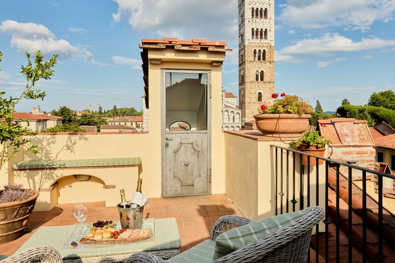 Discover the pinnacle of luxury in this stunning 16th-century penthouse apartment, boasting an expansive 300m² of elegantly designed living space. Positioned inside Lucca's ancient walls, directly opposite the Duomo, this remarkable residence offers spectacular 360° views, including from two private rooftop terraces. The apartment is flooded with natural light, featuring a 6-bedroom layout complemented by numerous indoor and outdoor living and dining areas. Combining historical charm with chic, iconic design, it includes modern amenities like air conditioning. Perfect for several couples or large families, this spacious villa provides the ultimate home-away-from-home for a dream vacation.